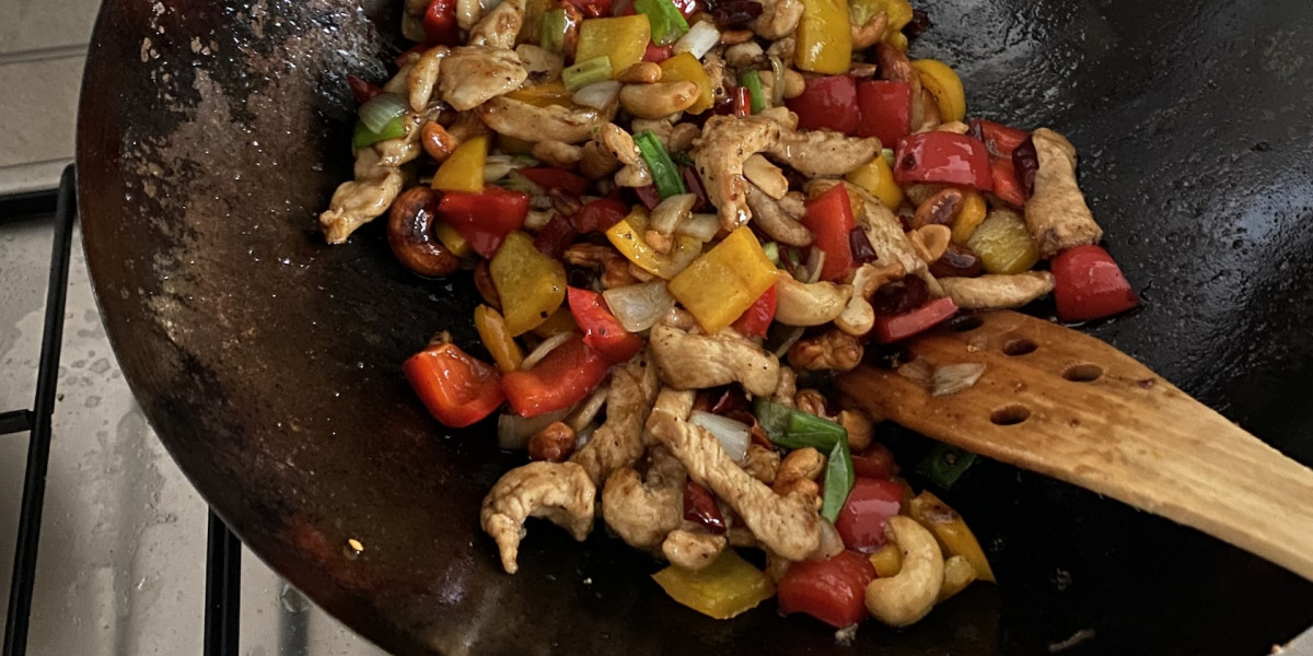 Hähnchen mit Speisestärke mehlen und mit reichlich Öl im Wok frittieren und beiseite stellen. Mit verbliebenen Öl das Gemüse kurz frittieren und beiseite stellen. Dann im selben Wok erneut Cashews und Chilies frittieren bis die Chilies dunkler werden und beiseite stellen. Restliches Öl aus dem Wok entfernen.