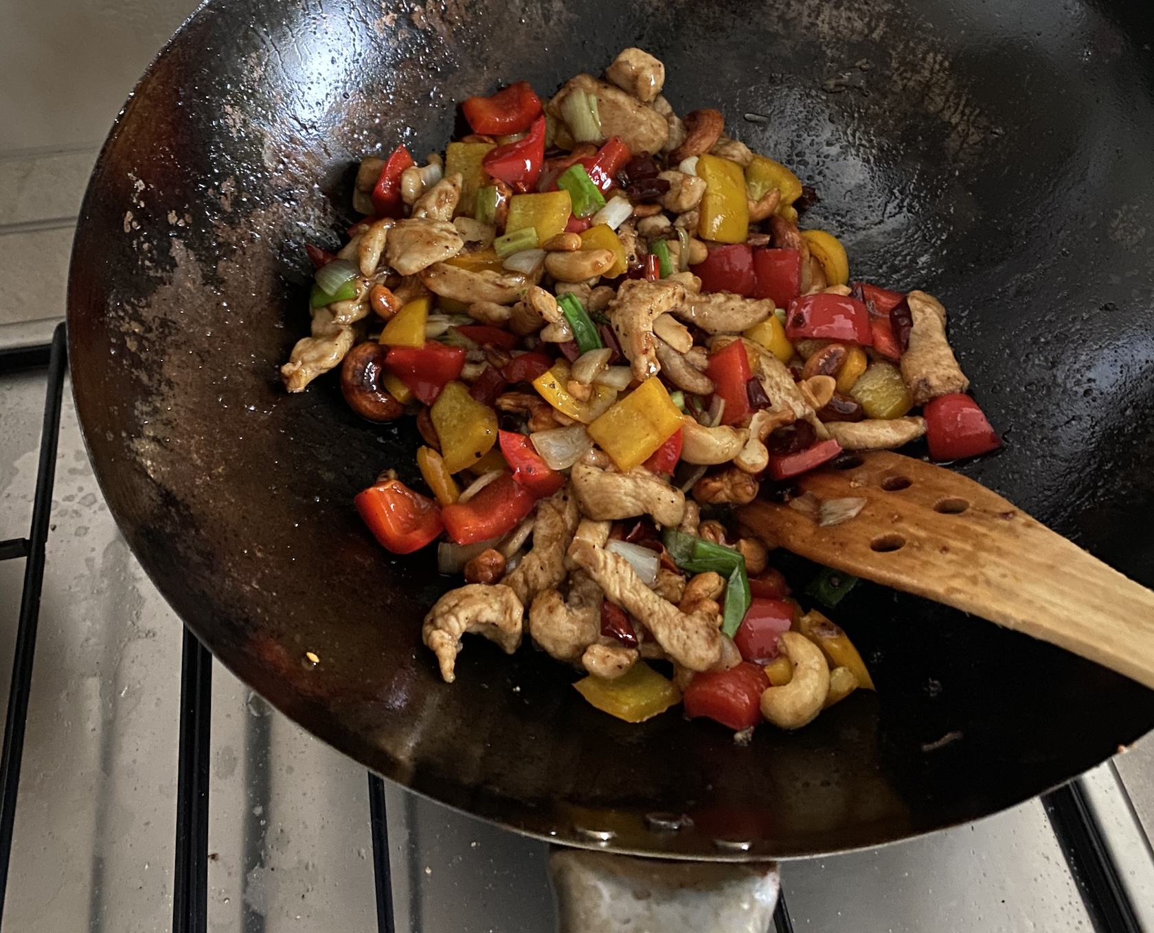 Hähnchen mit Speisestärke mehlen und mit reichlich Öl im Wok frittieren und beiseite stellen. Mit verbliebenen Öl das Gemüse kurz frittieren und beiseite stellen. Dann im selben Wok erneut Cashews und Chilies frittieren bis die Chilies dunkler werden und beiseite stellen. Restliches Öl aus dem Wok entfernen.